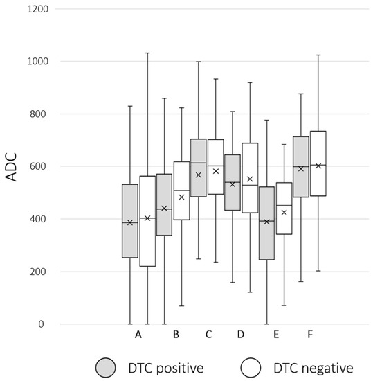 Group comparison between DTC (disseminated tumor cells)-positive (grey box) and DTC-negative (white box) patients regarding ADCmean bone marrow values: (A) right femur ADCmean, (B) os sacrum-ADCmean, (C) right os ilium ADCmean, (D) L 5-ADCmean, (E) T 7-ADCmean, and (F) sternum-ADCmean. The crosses indicate the mean value. No significant differences in group comparison were visible.