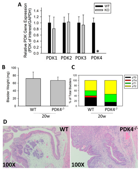 To evaluate the role of PDK4 in BCa development, the BBN-induced BCa model was used. This model has been shown to genetically and phenotypically recapitulate the basal subtype of human BCa and represents a gold-standard model in the field [31,32]. We initially assessed levels of the PDK isozymes in the bladder of PDK4−/− animals to determine whether PDK4 was selectively reduced in PDK4−/− animals. PDK1-3 expression was unchanged in the bladder, whereas PDK4 transcripts were largely undetectable (Figure 1A). To determine how PDK4−/− animals respond to BBN-induced BCa, WT or PDK4−/− mice were treated with 0.05% BBN via drinking water for 16 weeks, followed by 4 additional weeks with normal water (no BBN) for continued tumor formation (20 w total). No difference in tumor weight between WT and PDK4−/− mice was observed after 4 additional weeks of tumor formation time (Figure 1B). Tumor staging via H&E staining was performed by a board-certified pathologist, but again, no difference was observed between WT and PDK4−/− animals (Figure 1C,D). These data indicate that WT and PDK4−/− animals did not demonstrate any difference in early tumor formation.