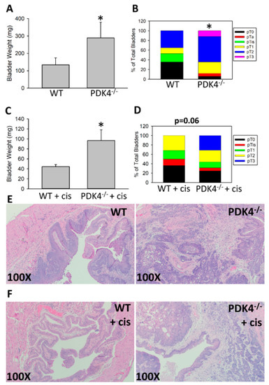 PDK4−/− mice have larger BBN-induced tumors than WT mice at later tumor stages with and without cisplatin treatment. WT (n = 17) or PDK4−/− (n = 17) animals were placed on BBN for 16 w, and tumors were allowed to grow for another 7 w. Bladder weights (A) and tumor stage (B) were assessed. In a separate experiment using WT (n = 22) and PDK4−/− (n = 16) mice, cisplatin was administered twice weekly at 3 mg/kg for the final 3 weeks. Bladder weights (C) and tumor stage (D) were measured. Representative H&E images are presented in (E,F) for untreated and cisplatin-treated animals, respectively. * p < 0.05.