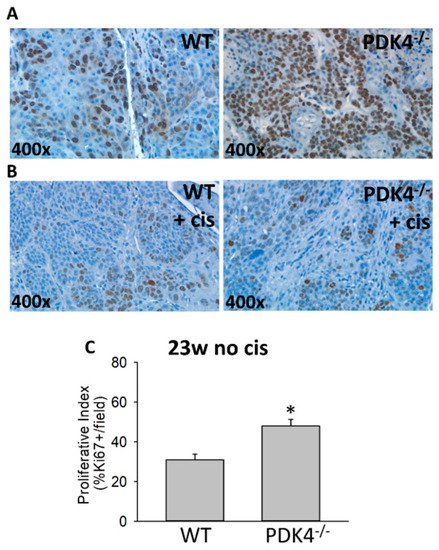 Increased proliferation in PDK4−/− tumors compared to controls. WT and PDK4−/− tumors were assessed for Ki67 positivity via immunohistochemistry. Untreated (A) and cisplatin-treated (B) tumors are presented at the indicated magnification. Proliferative index (C) was assessed by evaluating Ki67 positivity in three to four separate fields from each mouse. * p < 0.05.