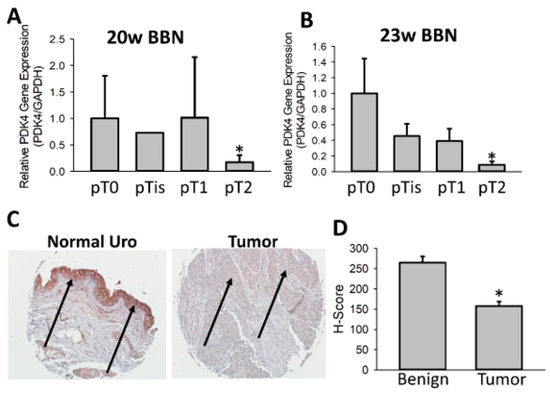 PDK4 is suppressed during BCa tumorigenesis. PDK4 gene expression was measured in RNA derived from WT murine tumors exposed to BBN. Tumors were delineated by stage by a board-certified pathologist to assess PDK4 expression across stages (A,B). A human tumor microarray was stained for PDK4 using normal (n = 18) or tumor samples (n = 77) (C). Tumors were quantified using H score (D). Arrows indicate urothelium/tumor. * p < 0.05.