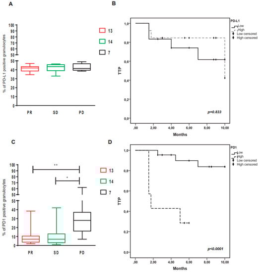 Moreover, when patients were separated according to the mean percentage of PD1+ granulocytes, a longer TTP could be observed in patients with a low PD1+ granulocyte percentage (log-rank test, p < 0.0001, Figure 1D). The mean ± SD follow-up was 3.2 ± 2.1 months in the 9 patients displaying a high PD1+ granulocyte percentage, while it was not reached in the 21 patients displaying a low PD1+ granulocyte percentage (less than 50% of patients had progression events during the follow-up period).