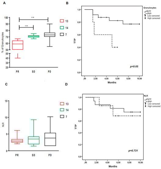 Baseline granulocyte percentage on total white blood cells and NLR in responders and non-responders to atezolizumab–bevacizumab: (A): box-plot graphic representation of granulocyte percentage in patients displaying a partial response (PR; 13 patients), stable disease (SD; 14 patients), and progressive disease (PD; 7 patients) to atezolizumab–bevacizumab. *** p < 0.001 by ANOVA test. (B): Kaplan–Meier survival curves comparing TTP in 34 patients treated with atezolizumab–bevacizumab displaying a high or low (according to mean values) circulating granulocyte percentage. Significant events were the HCC progression documented at imaging. Statistical p-values were generated by the log-rank test. (C): box-plot graphic representation of NLR in patients displaying a partial response (PR; 13 patients), stable disease (SD; 14 patients), and progressive disease (PD; 7 patients) to atezolizumab–bevacizumab. (D): Kaplan–Meier survival curves comparing TTP in 34 patients treated with atezolizumab–bevacizumab displaying high or low (according to mean values) NLR. Significant events were the HCC progression documented at imaging. Statistical p-values were generated by the log-rank test.