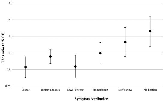 Symptom attributions reported by participants with diabetes versus those without when experiencing a change in bowel habits (vignette 2): multivariable logistic regression odds ratios, adjusted for age, sex, ethnicity, and comorbidity number. Note: Each symptom attribution was included as the outcome (binary yes/no outcome) in a separate multivariable model.