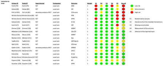 | Winters-Stone et al., 2021, [76] | Breast | 72 | 18 months | Early-stage, post-treatment, older (≥65 years) breast cancer survivors (n = 114) were randomized to 12 months of supervised aerobic (n = 37), resistance (n = 39), or stretching (active control; n = 38) training followed by 6 months of unsupervised home-based training | Supervised exercise can improve strength and physical functioning among older breast cancer survivors. Resistance training may lead to better improvements compared to aerobic or flexibility training, whether in a supervised or unsupervised setting |