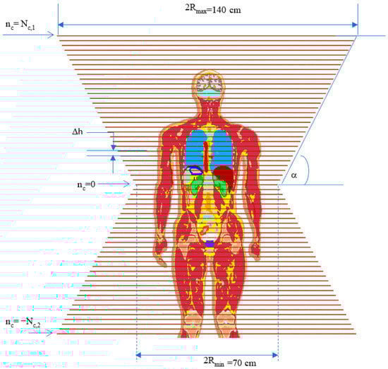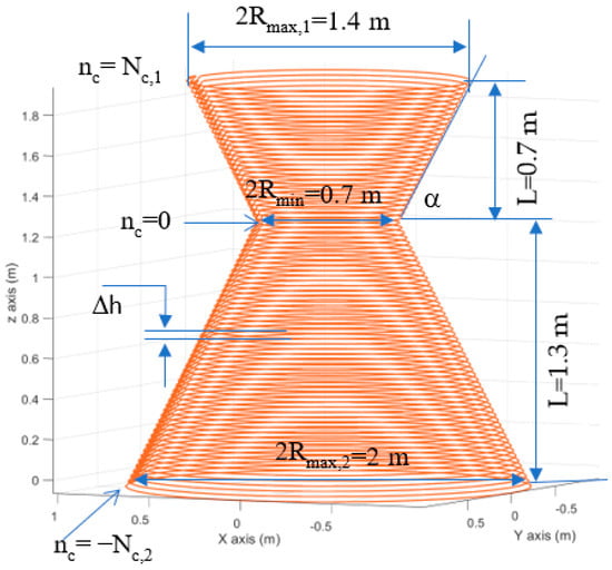 Human-sized coil; The system has a biconical shape and contains 1 + Nc,1 + Nc,2 turns/coils. Δh is the separation between two nearby coils, = Rmin + Δh (|nc|) tan(α) is the radius of the nc-th coil, where . is the radius of the nc = 0 coil’s radius, and α is a half flare angle between the upper and lower cones.