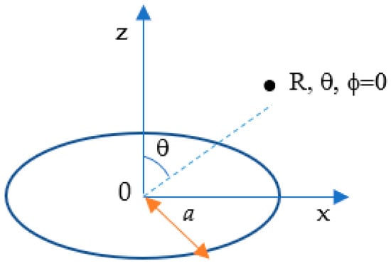 A current-carrying circular coil with a radius centered at the origin of a spherical coordinate R, θ, ϕ.
