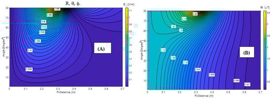 To overcome these issues, an optimal AMF coil geometry was researched using an integral equation solver, which provides the relationship between the current and the resultant electromagnetic field (see Section 2.3). For simplicity, first, the electric and magnetic fields were analyzed for a single circular current coil, Figure 3. Figure 4A,B show electric and magnetic field distributions on the R-θ plane when ϕ = 0 (i.e., y = 0) for the circular coil with a 35 cm radius carrying I = 1 [A] current, respectively. The calculated results show that the magnitude of the electric field decreases as the R-distance decreases. In addition, the electric field peak moves inside the a = 35 cm radius coil when R-observation is less than a. The magnetic field exhibits a similar but opposite trend, Figure 4. Namely, the magnitude of the magnetic flux density increases as the R-observation point moves toward the center. Using these results, one could achieve the desirable magnetic flux density around the axis of a current-carrying coil with acceptable electric field values by varying the α angle (α = 90 − θ) and the R-observation distance. Based on these results, we have decided to design and investigate a biconical shape coil α = 60° degree half flare angle. The results were evaluated against Helmholtz and solenoidal coils for achieving therapeutic 15 mT AMF at the pancreas. Table 1 Summarizes calculated maximum Joule heat SARJoule in the VF Duke model and alternating current magnitude during MNPH pancreatic cancer treatment.