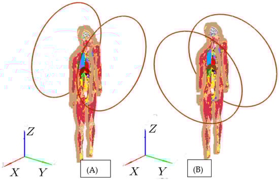 To illustrate the limitations of the standard approach for deep-seated tumors, we conducted numerical calculations of AMF distributions inside the 2 mm-resolution VF Duke model (Figure 1) at 100 kHz. The AEMFs are produced by 60 cm diameter Helmholtz coils in three configurations. In the first configuration Figure 5A), coils are placed front (centered at x = 28.6 cm, y = 47.2 cm, z = 123.6 cm) and back (centered at x = 28.6 cm, y = −13.8 cm, z = 123.6 cm), and in the second configuration Figure 5B), coils are placed left (centered at x = −1.4 cm, y = 17.2 cm, z = 123.6 cm) and back (centered at x = 58.6 cm, y = 17.2 cm, z = 123.6 cm). The coils centers are aligned to the pancreas center (x = 28.6 cm, y = 17.2 cm, z = 123.6 cm). Studies in [31] showed that for achieving therapeutic levels of heating at the pancreas, the Dartmouth MNPs, which provide high SAR due to MNP at low AMF strength [31], would require at least 15 mT. Figure 6 shows the Joule heating SARJoule distributions inside the VF Duke model. The 10K ampere currents are required in the single-turn coils to achieve the required 15 mT magnetic field at the pancreas’ center. The maximum SARJoule = 22.5 KW/kg is observed in spinal cerebrospinal fluid. This high SARJoule resulted in a temperature rise of 100-s °C in the normal tissues in less than 1 min. Similar results were observed for the Helmholtz coil placed symmetrically to the x-axis ((A) and (B), see Figure 5) and z-axis.