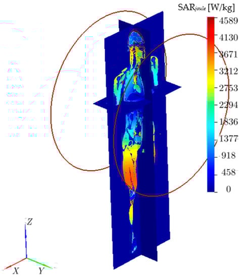 3.2. Human-Sized Biconical Coil: SARJoule and Temperature Distributions