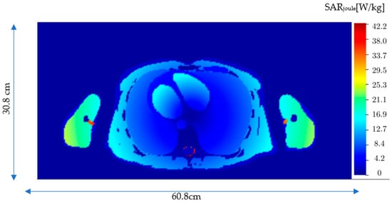 The maximum induced Joule heating temperature reaches about 41.7 °C in the shoulder regions, which are close again to the coils. Although the temperature elevation in the arms and shoulders is below 42 °C, one could utilize other techniques, such as repositioning the patient’s arms or using surface cooling pads to further manage this temperature.
