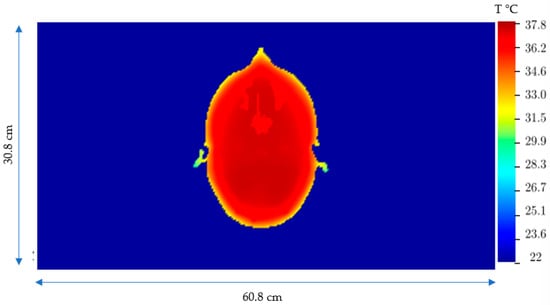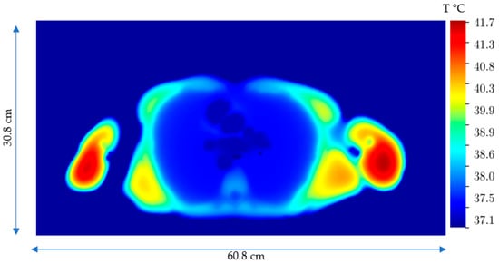 The steady-state temperature was calculated for the VF Duke model by dividing the entire computation volume into Nx · Ny · Nz = 43,538,880 voxels of size 2 mm × 2 mm × 2 (Nx = 304, Ny = 154, Nz = 930). We assumed that the VF Duke model was placed at room temperature, 22 °C. The simulations were run for 8 h to reach steady-state conditions to establish the baseline. The steady-state was then used as an initial temperature distribution to calculate the induced temperature due to Joule heating and MNP heading. Figure 7 shows the Joule heating, SARJoule, distribution on a plane containing the maximum SARJoule. As expected, the maximum SARJoule is in the cerebrospinal fluid within the spine. Figure 7 shows the temperature distribution after 20 min in the same plane containing the maximum SARJoule. The result shows that although the maximum SARJoule is within the cerebrospinal fluid, the maximum temperature after 20 min is registered in arms, which are close to the coils. The temperature distribution after 20 min on the plane with maximum temperature due to the Joule heating, SARJoule, is depicted in Figure 8.