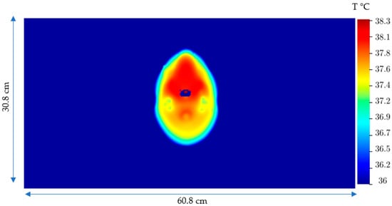 Temperature distribution after 20 min on the xy plane (z = 140.6) with the maximum temperature due to the Joule heating, SARJoule.
