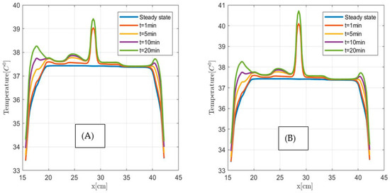 Temperature versus distance along the observation line (the black double arrow line in Figure 11) for the 1 cm3 size pancreatic tumor. (A) for 3 µL and (B) 5 µL Dartmouth MNP concentration per gram tumor.