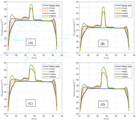 Temperature versus distance along the observation line (the black double arrow line see Figure 11) for 2 cm3 (A,B) and 3 cm3 (C,D) size pancreatic tumors at steady state and after 1 min, 5 min, 10 min and 20 min MNPH exposure times. (A,C) graphs show modeled results for 3 µL and (B,D) figures for 5 µL Dartmouth MNP concentration per gram tumor, respectively.