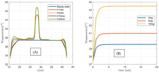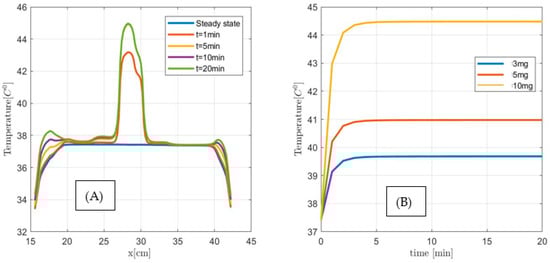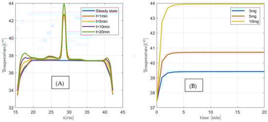 (A) Temperature versus distance along the observation line (the black double arrow line see Figure 11) for a 2 cm3 size pancreatic tumor with 10 µL MNP for steady state, and after 1 min, 5 min, and 10 min exposure time. (B) Temperature versus time at the center of 1 cm3 size pancreatic tumor for 3 µL (3 mg), 5 µL (5 mg), and 10 µL (10 g) MNP per gram tumor.