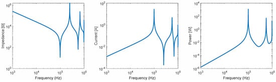 After performing a set of calculations, the required capacitance value for the resonant f = 100 kHz frequency LC circuit was determined to be C = 0.625 nF. Figure 18 shows the calculated impedance (Ohm), current (A), and power(W) versus Frequency for the biconical coil connected to the external V = 312.5 V voltage source and C = 0.625 nF capacitor in series. These results show that the human-sized biconical coil can generate a desirable 133 A current and deliver 25 kW of power at a 100 kHz frequency.
