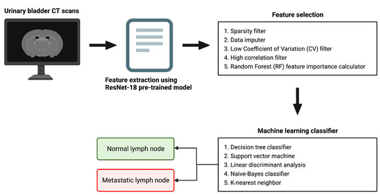 The authors of [25] claim that feature extraction when governed by domain knowledge performs better than CNN-based classifiers that are capable of automatic feature generation. The task in this case was to classify two early stages of bladder cancer that are histologically difficult to differentiate, namely Ta (non-invasive) and T1 (superficially invasive). The dataset comprised a total of 1177 bladder scans—460 non-invasive, 717 superficially invasive. CNN classifiers achieved the highest accuracy of 84.00%, performing considerably poorer than supervised machine learning classifiers that were trained on manually extracted features. The aforementioned literature on CNNs comprises end-to-end models, where both training and testing are performed on the same dataset. The problem with such an approach is that deep neural networks require large quantities of training data in order to avoid the pervasive issue of over-fitting. As a substitute to end-to-end deep models, researchers make use of a concept called “transfer learning”, where the neural network is first pre-trained on a large dataset such as ImageNet, and the learned weights are subsequently fine-tuned on the small target data. Since we were using a small dataset of 200 CT scans for this study, we decided to make use of transfer learning to improve classification results and alleviate overfitting. A 71-layer ResNet-18 model pre-trained on the publicly available ImageNet dataset was utilized to extract features from the bladder scans. The extracted features, after feature selection using a combination of supervised and unsupervised techniques, were finally used to perform classification by five different machine learning classifiers, namely k-nearest neighbor (KNN), support vector machine (SVM), linear discriminant analysis (LDA), decision tree (DT) and naive Bayes (NB).