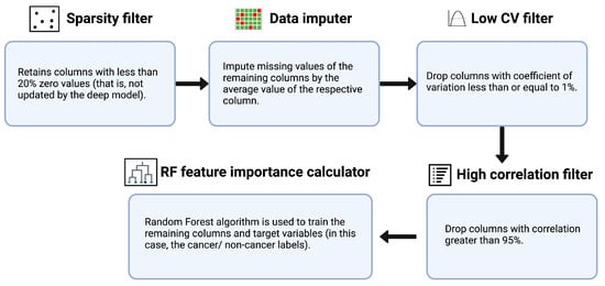 An ensemble feature selection technique was used to select the most important features from the originally extracted feature vector—which was obtained using five different pre-trained models, namely AlexNet, GoogleNet, Inception V3, ResNet-50 and XceptionNet, for performing the classification of normal vs. metastatic lymph nodes. First, we make use of a “sparsity filter” to remove the features that were not updated by the deep model. Through this step, we not only exclude features that have low variance but also automatically remove those that are less likely to have an impact on the classification process. Next, we utilize the “data imputer” to impute the unchanged values of the remaining columns by the mean value of the respective column. Subsequently, we made use of the “low coefficient of variation (CV) filter” to drop features with a CV value of less than 0.01 CV, or standard deviation normalized by mean, is a measure of information content; a lower CV indicates features with a lower normalized variance. Furthermore, in the next step, a correlation matrix was generated, which contains information regarding the cross-correlation values between every pair of features. For each pair with >95% correlation, the one with a lower correlation to the output is dropped. Finally, we employed random forest, a boosted decision tree algorithm, to train the remaining columns and target variables for feature importance score generation. The number of trees was set to a default value of 100, and the Gini index was used as the metric for calculating feature importance. The first four steps were unsupervised (statistical approaches used to perform selection on features alone, not labels); the last feature importance calculation step was supervised (relationship between dependent and independent variables critical in determining feature selection). Figure 2 provides a schematic depiction of the feature selection algorithm.