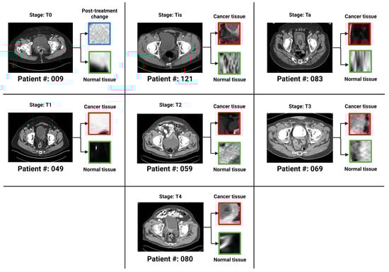 There were a total of 100 CT scans of the pelvis with intravenous contrast images visualizing the bladder, obtained from 100 patients (one image captured per patient). Each scan had 2 masks (normal bladder wall and bladder cancer) manually annotated by encompassing both the entire region of biopsy-proven malignancy and the normal-appearing bladder by two radiologists familiar with bladder imaging, which were used to extract the respective regions of interest (ROI)—therefore resulting in 200 ROIs (100 normal tissue and 100 abnormal tissue). These ROIs were used as input for classification instead of the entire image. The patients were distributed across seven bladder cancer stages, namely , , , , , and . Figure 3 provides an axial CT scan with IV contrast, along with its corresponding region of interest (ROI) on the bladder wall, pertaining to each of the seven stages. represents a stage where the tissue of interest shows no evidence of malignancy, possibly but not necessarily following tumor resection and/or chemotherapy. This indicates carcinoma in situ, where the malignant cells only involves the innermost lining of the bladder wall. represents a stage where malignant cells involve the connective tissue beyond the innermost lining without involvement of the bladder muscle. represents the malignant spread of tumor involving the bladder muscle. represents a stage where malignant mass spreads outside the confines of bladder muscle with involvement of the perivesical fat. stage indicates the spread of tumor beyond the bladder with involvement of abdominal/pelvic wall and/or nearby organs. , and stages are classified as non-muscle-invasive bladder cancer (NMIBC); , and stages are classified as muscle-invasive bladder cancer (MIBC) [4,27]. Figure 4 is a pictorial depiction of the different stages of bladder cancer. As is evident from Figure 3, the stages are difficult to distinguish on visual inspection—thereby making it suitable for classification using AI-based models. Table 2 provides a summary of the number of patients per stage.