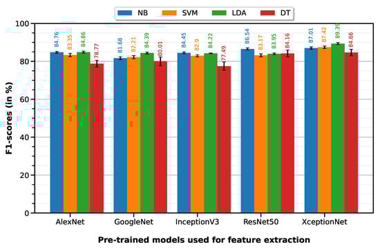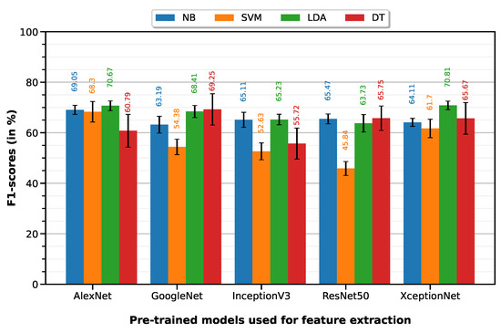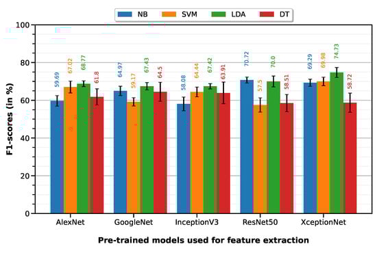 F1-scores of the 10-fold machine learning classifiers on features extracted from each of the five pre-trained deep models.