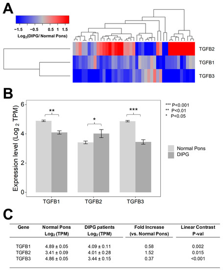 Selective upregulation of TGFB2 mRNA expression in DIPG tumor samples. Archived TGFB1/2/3 mRNA expression levels (in log2-transformed TPM) for primary tumor samples from 41 DIPG patients, including 11 DIPG patients with unknown H3K27M mutational status, 4 H3K27M- mutant DIPG patients, and 26 H3K27M-mutant DMG patients, whose brain tumors were localized to pons/brainstem, obtained from cBioPortal were compared to TGFB1/2/3 mRNA expression levels (log2 TPM) in normal pons samples from 29 pons regions (downloaded from https://www.proteinatlas.org/about/download, accessed on 17 December 2022). The TGFB2 expression levels for these 29 normal pons regions were determined by averaging the TPM values for 2–8 independent samples/region from 21 subjects. Expression of log2-transformed TPM values for TGFB1/2/3 mRNA levels in the tumor samples from DIPG patients were mean-centered to the mRNA expression levels in normal pons samples and depicted in the heatmap (A) representing overexpression (red color) or underexpression (blue color). (B) The bar charts illustrate reduced expression levels for TGFB1 and TGFB3 mRNA but amplified expression levels for TGFB2 mRNA, in tumor specimens from DIPG patients (dark grey bars) when compared to normal pons samples (light grey bars). (C) Statistical significance of differences in TGFB1/2/3 mRNA expression levels (in log2-transformed TPM values) was assessed using two-way ANOVA with linear contrasts using FDR-adjusted p-values. We documented a statistically significant 1.52-fold increase in TGFB2 mRNA levels (p = 0.015) along with statistically significant decreases in TGFB1 mRNA (1.72-fold decrease; p = 0.002) and TGFB3 (2.7-fold decrease; p < 0.001) mRNA levels.