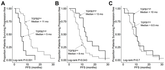 Amplified expression of TGFB2 is associated with shorter PFS in DIPG and DMG patients. Archived clinical outcome data for 41 DMG patients, including 11 DIPG patients with an unknown H3K27M mutational status, 4 H3K27M-mutant DIPG patients and 26 H3K27M-mutant DMG patients, whose brain tumors were localized to brainstem/pons, obtained from cBioPortal for Cancer Genomics (https://pedcbioportal.kidsfirstdrc.org/) was combined with RNAseq-based mRNA expression data for TGFB2 (A), TGFB3 (B), and TGFB1 (C) to assess the potential impact of the respective TGFB isoform levels on PFS. For patients with missing information regarding progression of disease, death was used as the first event when evaluating the PFS outcome. Log2-transformed, TPM-normalized RNAseq values were rank-ordered according to expression level for each TGFB isoform. Patients whose expression levels for a given TGFB isoform was greater than or equal to the upper quartile (solid line) were compared to the remaining patients (dashed line). (A) TGFB2high patients with exhibited a significantly worse PFS outcome than rest of the patients (median PFS for TGFB2high subset: 5 (95% CI: 5–NA) months, 11 events, N = 11); median PFS for TGFB2low subset = 11 months, 95% CI: 10–13 months, 30 events, N = 30; log-rank chi-square = 14.7, p = 1.3 × 10−4). (B) TGFB3high patients (median PFS = 13 months, 95% CI: 11–NA months, 11 events, N = 11) exhibited a significantly better PFS outcome than TGFB3low patients (median PFS = 8 months, 95% CI: 7–11 months, 30 events, N = 30; log-rank chi-square = 4.1, p = 0.043). (C) TGFB1high patients (median PFS = 10 months, 95% CI: 9–NA months, 11 events, N = 11) and TGFB1low patients exhibited similar OS outcomes (median PFS = 8.5 months, 95% CI: 7–13 months, 30 events, N = 30; log-rank chi-square = 0.2, p = 0.7).