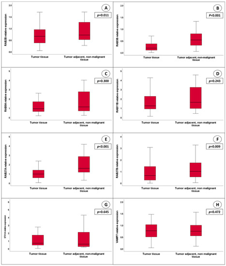 Relative gene expression between tumor (n = 109) and tumor-adjacent (n = 60) tissues of RAB2B (A), RAB3B (B), RAB9A (C), RAB11B (D), RAB27A (E), RAB27B (F), STX1A (G) and VAMP7 (H) in our CRC patients’ cohort. Gene expression of RAB2B, RAB3B, RAB27A, and RAB27B is lower in tumor tissues compared to tumor adjacent, non-malignant tissues, while for the other genes no statistically significant differences are observed.