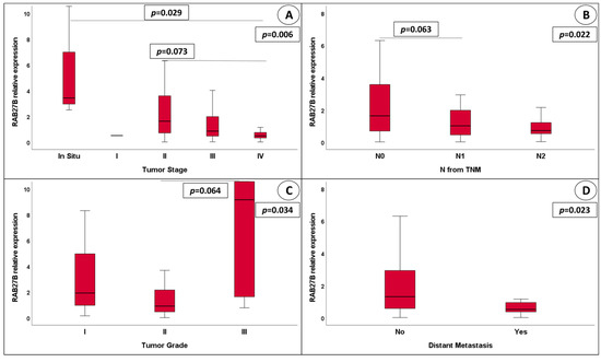 When analyzed with regard to clinicopathological parameters, RAB27B mRNA expression showed significant association with tumor stage. More specifically, RAB27B expression was gradually decreased as stage was increased, with the highest expression being observed in in situ tumors and the lowest being observed in stage IV tumors (p = 0.006, Figure 2A). Similarly, RAB27B expression was associated with N status, with expression being gradually decreased from N0 status (without lymph nodes infiltration) to N2 status (tumor infiltration in more than 4 regional lymph nodes) (p = 0.022, Figure 2B). Regarding tumor grade, higher RAB27B expression was observed in grade III tumors, compared to grade I and grade II tumors (p = 0.023, Figure 2C). Moreover, RAB27B expression was higher in tumors without distant metastasis compared to those with metastases (p = 0.034, Figure 2D). Among all other genes no statistically significant difference was observed in their expression and tumor stage or tumor grade or N status (Supplementary Figures S4–S6).