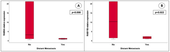 Relative gene expression of RAB9A (A) and RAB11B (B) with regards to the presence of distant metastases (n = 109). Patients with distant metastases have lower tumor expression of RAB9A and RAB11B.