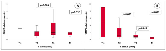 Among the other studied genes, RAB9A and RAB11B were associated with distant metastasis. In particular, lower RAB9A and RAB11B expression was observed in tumors with distant metastases (p = 0.008 and p = 0.022, Figure 3A,B, respectively). Expression of all genes was also analyzed in regard to TNM. TNM staging system is a tumor classification system in which T describes the size of the tumor and any spread into nearby tissue, N describes infiltration of nearby lymph nodes, and M describes presence of distant metastasis. In regards to T status from TNM staging system, RAB2B expression differed among different T status (p = 0.032, Figure 4A), as well as VAMP7 expression was gradually decreased as T was increasing (p = 0.036, Figure 4B). Among all other genes no statistically significant difference was observed in their expression and distant metastasis or T status (Supplementary Figures S7 and S8).