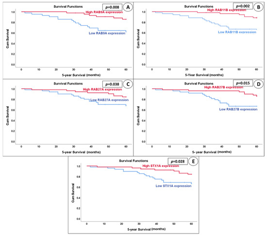 Interestingly, when gene expression was analyzed in terms of patients’ survival, expression of five out of the eight studied genes was associated with a 5-year survival, following the same pattern. More specifically, high tumor expression of RAB27A, RAB27B, RAB9A, RAB11B, and STX1A was favorable of a 5-year survival (p = 0.038, p = 0.015, p = 0.008, p = 0.002, and p = 0.028, respectively, Figure 5), while no association was observed with the rest of the genes (Supplementary Figure S9).
