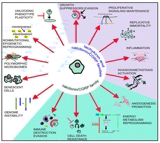 The 14 hallmarks currently considered to be responsible for the development of cancer are indicated. Five hallmarks (blue background) are mediated by peptides belonging to the tachykinin and calcitonin/CGRP peptide families, and four hallmarks (green background) are mediated by peptides belonging to the calcitonin/CGRP peptide family.