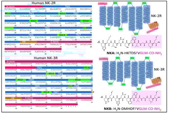 Complete sequences and snake plots of the neurokinin receptors 2 and 3 and their preferential endogenous agonists, NKA and NKB. The domains of NK-2R and NK-3R (N- and C-terminal regions, transmembrane helices (TM), Helix 8, and intra- and extracellular loops) are highlighted in color. Color areas illuminate the amino-acid sequence of the C-terminal end of neurokinins. The sequences and structures of the receptors are from the GPCR database [47], and the peptide structures were drawn with KingDraw software (Version 1.1.0) [48].