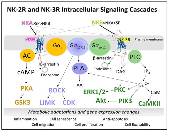 NKA and NKB favorably bind and activate NK-2R and NK-3R, respectively, but they can also bind and activate NK-1R. Consequently, when studying the intracellular signaling of NK-2R and NK-3R, one should consider the possible activation of NK-1R by both neurokinins. The presence, absence, and abundance of the three neurokinin receptors and their endogenous agonists result in a possible explanation for the multiple outcomes and physiological and pathological consequences in various tissues and organs. Redundance of tachykinin receptors may be a compensatory mechanism [72]. It, however, may also serve excessive stimulation leading to malfunction. For example, NKA commits NK-1R, not NK-2R, in mouse macrophages to activate cellular events dependent on transcription factor NF-κB [72]. Basic information on neurokinin signaling comes from experimental analysis in cell lines and cell expression systems where a total determination of intracellular second messengers points to the activation of specific biochemical cascades. However, the study of signaling endosomes and compartmentalized intracellular signals should also be considered [17]. This section describes the central signaling cascades activated through NK-2R and NK-3R in different tissues. Figure 6 represents how NK-2R and NK-3R recruit the transducers Gαs, Gαq/11, and Gα12/13 protein subunits. As a result, phospholipase C, adenylyl cyclase, and phospholipase A2 turn on, respectively. Downstream reactions include numerous protein kinases that control cellular function through transient phosphorylation of their respective substrates. Therefore, neurokinin signaling results in a pleiotropic display of multiple players that kindle rapid metabolic adaptations and short- and long-term control of gene expression. The effects vary between cells and tissues and depend on the presence and abundance of receptors. The concentrations and the agonists’ availability also affect the receptor protein’s functionality. Deregulation of these signaling systems causes severe alterations in cell proliferation, cell migration, and inflammation.