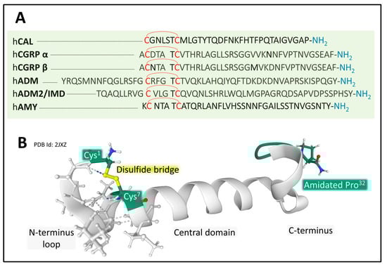 The human calcitonin family of peptides includes calcitonin (CT), α and β forms of CGRP, amylin (AMY or islet amyloid polypeptide (IAPP)), AM, and AM2 or intermedin. Their amino-acid sequence length varies from 32 in CT to 52 for ADM [47] (Figure 7). Although the amino-acid sequence among the six peptides is variable, they share common architectural traits essential for functionality, including a coil structure, a central area showing a helical or disordered structure, and an amidated C-terminal amino acid [111,112,113]. These peptides activate a family of receptors belonging to class B GPCR to serve numerous and diversified functions, such as plasma calcium reduction (CT), food intake modulation (AMY), and vasodilatation and inflammation (CGRPs) in different tissues [112,113,114].