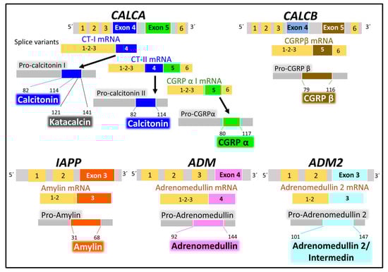 Five human genes encode the calcitonin/CGRP family of peptides. CALCA, CALCB, and AM are on chromosome 11, IAPP is on chromosome 12, and AM2 is on chromosome 22 [34,113]. The peptide products synthesized are tissue-specific in physiological and pathological situations because spliced variants transcripts encode different products. For example, a CALCA gene transcript variant encodes calcitonin in the thyroid gland in physiological conditions. Another variant of the CALCA gene encodes the neuropeptide CGRPα in the neural tissues [116] (Figure 8).