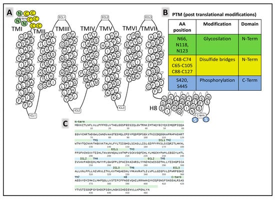 (A) is a snake plot [47] of the general architecture of CLR (calcitonin receptor-like receptor), indicating transmembrane segments and intra- (ICL) and extracellular (ECL) loops. (B) displays amino acids undergoing post-translational modifications [25]. (C) shows the primary structure of the receptor and the sequences forming different protein domains [47], TM (transmembrane), ECL (extracellular loops), ICL (intracellular loops), and H8 (helix 8).