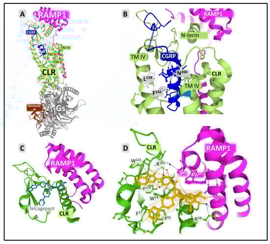 (A) shows the crystal complex formed by CLR (calcitonin receptor-like receptor in green) bound to protein RAMP1 (receptor activity modifying protein, in pink), Gs heterotrimeric protein (gray), and nanobody 35 (brown). The interaction of RAMP 1 with the transmembrane segments III, IV, and V and the N-terminal portion of CLR are indicated in the figure. (B) depicts the binding site of CGRP (calcitonin gene-related peptide, blue), showing the amino-acid positions of CLR contacting the agonist peptide. (C) shows the crystal structure of an ectodomain complex of the CGRP receptor bound to the antagonist telcagepant (MK0974). (D) highlights the contacts between the antagonist and the receptor structure. The figures mark the position of transmembrane (TM) helices. Dashed lines indicate weak interactions stabilizing peptide structure. The representations in (A,B) corresponding to PDB ID 6E3Y [123], and those in (C,D) corresponding to PDB ID 3N7S [127] were obtained from the Protein Data Bank (PDB [65]) and colored with Mol* free web-based software [71].