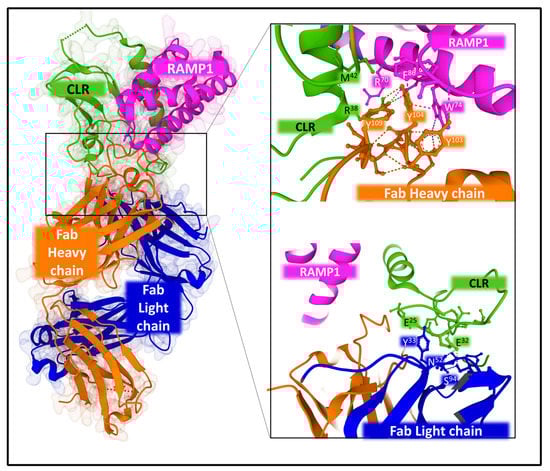 Structure of the complex CLR-RAMP1 co-crystalized with monoclonal antibody 6UMG. The figure on the right-hand side depicts some atomic contacts of the antibody heavy chain (upper panel) and the antibody light chain (lower panel) with the interface of the complex CLR-RAMP. The structures corresponding to PDB ID 6UMG [129] were obtained from the Protein Data Bank (PDB [65]) and designed with Mol* free web-based software [71].