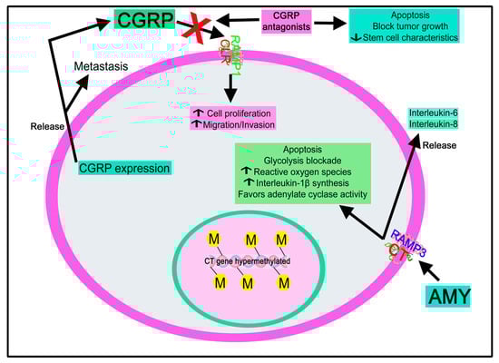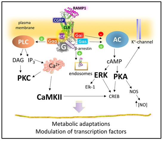 Like many other GPCRs, the CGRP receptor signals through several kinase cascades, which amplify the signal to modulate many intracellular components, from metabolic enzymes to transcription factors [38,84]. As CGRP may signal through CGRP receptors, AM, and AMY receptors, delimiting the activity of CGRP only through CGRP receptors may be difficult [132]. However, signaling profiles depend on the selectivity of the agonist-receptor binding, the availability of signal transducers, and intracellular kinase targets.