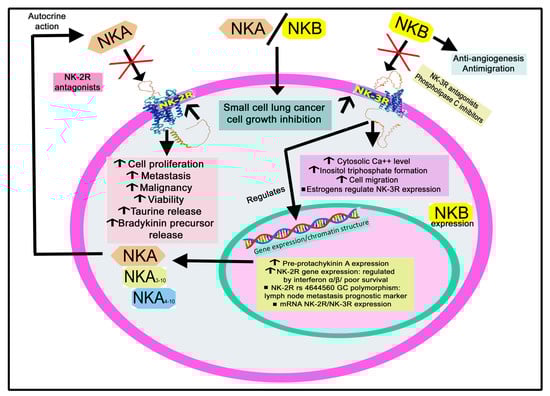 Pulmonary carcinoid tumors express mRNA pre-protachykinin A; in some, NKA/SP has been reported [148]. NKA and NKB inhibited the growth of small-cell lung cancer cells [20].