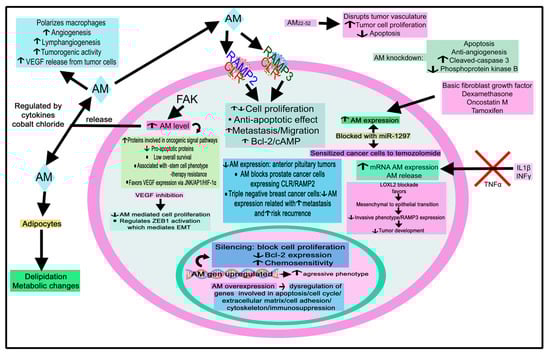 - Zudaire, E.; Martínez, A.; Garayoa, M.; Pío, R.; Kaur, G.; Woolhiser, M.R.; Metcalfe, D.D.; Hook, W.A.; Siraganian, R.P.; Guise, T.A.; et al. Adrenomedullin Is a Cross-Talk Molecule That Regulates Tumor and Mast Cell Function during Human Carcinogenesis. Am. J. Pathol. 2006, 168, 280–291. [Google Scholar] [CrossRef]