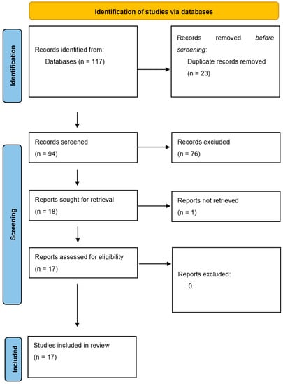The literature search initially turned up 117 documents, 23 of which were duplicates. Ultimately, 17 publications were included after verifying eligibility and inclusion criteria (Figure 1). Original articles made up the majority of publications (n = 15), followed by reviews (n = 2). According to the 2011 criteria published by the Oxford Centre for Evidence-Based Medicine, every study considered was given a level 4 or 5 confidence rating for clinical research.