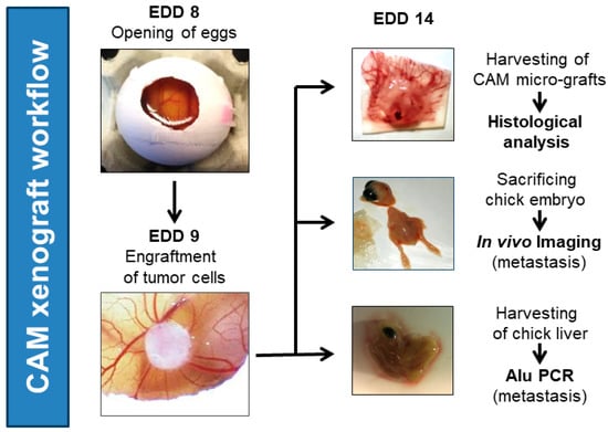 Moreover, it is a relatively easy to handle, highly reproducible, reliable, time-effective, and low-cost model that allows for screening experiments and high throughput analyses in a short experimental time. Within 5 days, tumor sizes of up to 1 cm may be seen with a reasonable quantity of tumor cells engrafted, which allows for ovograft growth observation using the naked eye of the investigator. However, one must admit that reaching a sufficient tumor size for further tissue analyses may be hampered if engrafted tumor cells are only slowly growing. Animal protocol approvals are not required for the use of the CAM model (country-dependent). Moreover, being naturally immunodeficient until embryonic day (ED) 10, transplantations from different tissues and species may be performed with only minor immune responses, whereas at ED16, cytotoxic T cells and monocyte populations are available [78]. Furthermore, in contrast to the CAM model, murine in vivo models allow for a longer observation time. Additionally, detecting metastasis in the chicken embryo might be challenging due to the short time period of growth and a circulation pattern that differs from the human pattern. However, for both in vivo models (CAM and mouse), the biological and physiological settings are well discovered. Moreover, both allow for in vivo imaging (summarized in [28,33,36,38,78,79,80]).