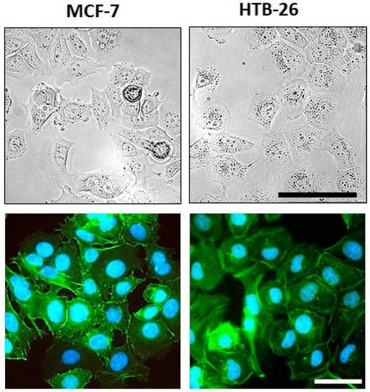 Morphology and F-actin organization of MCF-7 and MDA-MB-231 breast cancer cells. (Upper row) Representative images of the cell morphology of MCF-7 and MDA-MB-231 breast cancer cells at ~70–80% confluency in adherent culture; scale bar: 100 µm (applies to both cell lines). (Lower row) Examples of fluorescence images of the F-actin organization in MCF-7 and MDA-MB-231 breast carcinoma cells; green—F-actin; blue—nuclei; scale bar: 50 µm (applies to both cell lines).