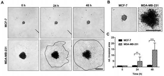 Invasive growth rate of MCF-7 and MDA-MB-231 breast cancer cells in vitro. (A) Representative light microscopy images of MCF-7 and MDA-MB-231 spheroids and their surrounding invasion area 0 h, 24 h, and 48 h after embedment into an artificial Matrigel ECM. Dotted lines mark the boundaries of the invasion area of MDA-MB-231 cells. Scale bar: 500 µm (applies to both cell lines and all images). (B) Digitally enlarged images of MCF-7 and MDA-MB-231 spheroids already shown in (A) after 48 h of incubation. Scale bar: 500 µm (applies to both cell lines and all images). (C) Time-dependent invasive growth rate of MCF-7 (n = 16) and MDA-MB-231 (n = 16) cells (defined as relative invasion area) as determined by dividing the measured invasion area (24 h and 48 h) by the initial spheroid size (area occupied by spheroids at 0 h). Mann-Whitney test: values represent means ± standard deviations (SD). ** indicates p < 0.01; *** indicates p < 0.001.