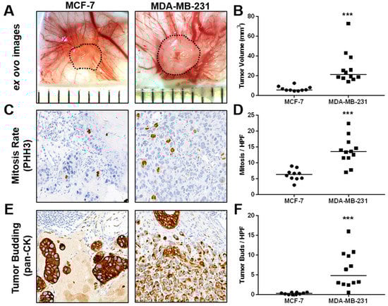 In vivo growth and characterization of tumor aggressiveness of MCF-7 and MDA-MB-231 breast cancer cells in the CAM xenograft assay. (A) Example ex ovo images of CAM ovografts harvested five days post-engraftment of MCF-7 and MDA-MB-231 cells onto the CAM of fertilized SPF chicken embryos. Scattered lines indicate tumor boundaries. Individual ruler segments define a length of 1 mm. (B) Tumor volume of ovografts after 5 days of incubation on the CAM. (C) Representative images of mitotic figures as detected in PHH3-stained tissue sections of MCF-7 and MDA-MB-231 CAM ovografts. (D) In vivo mitotic rate of MCF-7 and MDA-MB-231 cells as determined by the average number of mitotic figures per high-power field (HPF) in PHH3 IHC-stained tissue sections of CAM ovografts. (E) Example images of pancytokeratin-stained tissue sections of MCF-7 and MDA-MB-231 CAM ovografts as applied for the assessment of invasiveness and tumor budding at the tumor invasion front. (F) Tumor budding rate of MCF-7 and MDA-MB-231 cells as determined by the average number of tumor buds per HPF at the tumor invasion front in pancytokeratin-stained tissue sections of CAM ovografts. All data are presented with medians, and statistical analyses were performed using the Mann-Whitney test; MCF-7: n = 10, MDA-MB-231: n = 12; *** indicates p < 0.001.