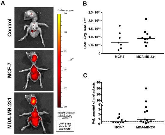 Using fluorescence imaging of the chicken embryo (Figure 5A,B), no significant differences could be detected between the two cell lines with respect to their dissemination potential; a subset of chicken embryo livers from MDA-MB-231-derived ovografts, however, provided a particularly high signal in the human-specific Alu qPCR analysis (Figure 5C).