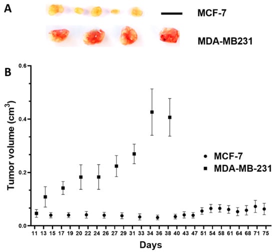 In vivo growth potential of MCF-7 and MDA-MB-231 breast cancer cells in the subcutaneous mouse model. (A) Resected tumor xenografts, scale bar: 1 cm (applies to both cell lines). (B) Tumor volume in cm3 over time (days after inoculation of MCF-7 tumor cells (n = 5 animals) and MDA-MB-231 tumor cells (n = 4 animals); mean/standard error of the mean).